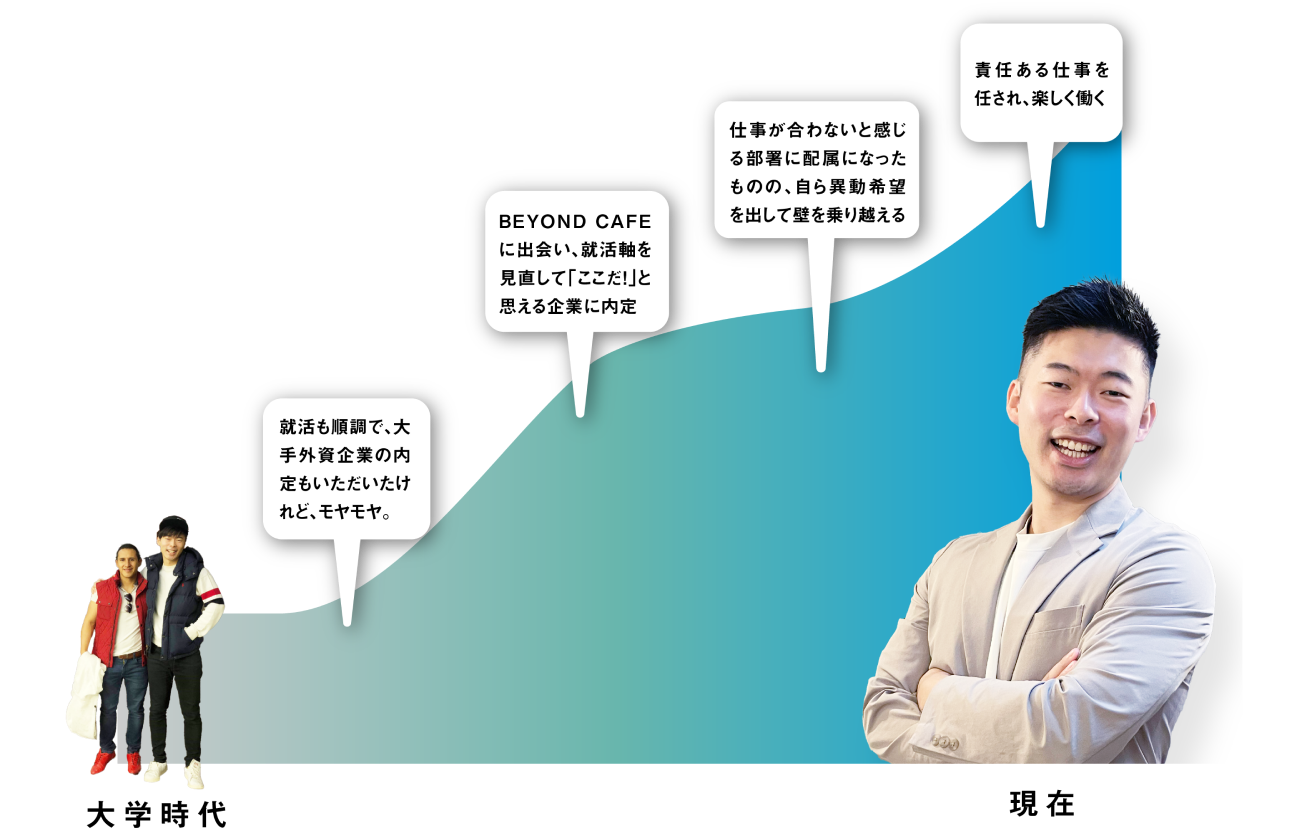もともと、20代で自分のスキルや強みを伸ばしたいという思いがあり、それが実現できそうな会社を選ぼうとしていました。ただ、それがどういう会社なのかあまり具体化できていなかったんです。 BEYOND CAFEのイベントで「もっとしっかり考えないと」と感じてから、カルさんと面談を重ねました。その中で僕自身の価値観が引き出され、具体と抽象の両面で言語化していったのです。その結果「立てるバッターボックスの数と質」が大事という軸が明確になり、納得いく形で就職先を選べました。
