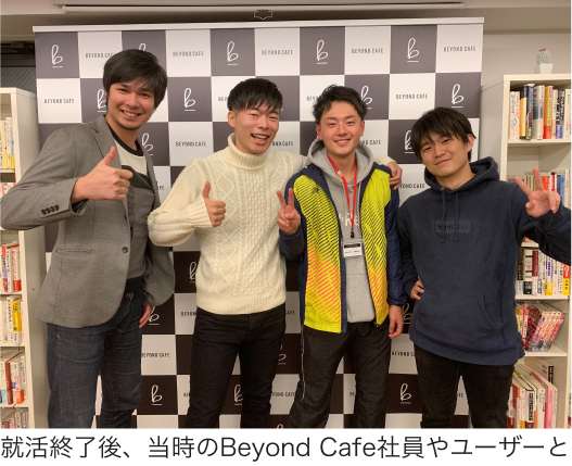 自分も知らない自分を知ることができたことは、就活はもちろんその後の人生にもすごく活きています。自分自身の価値観を深くから引き出してもらえるのは、なかなかない経験でした。 また、自分が思っていた就活とは全く違う就活を提案してくれて、キャリアの選択肢を広げてくれます。もともと僕は大手・外資系企業しか見ていなかったので、RIZAPグループ社に就職するという選択肢は、BEYOND CAFEに出会う前は全くなかったんです。 就活のやり方も起業選びも、自分が持っていない視点からの提案をもらえるところがおすすめポイントです。