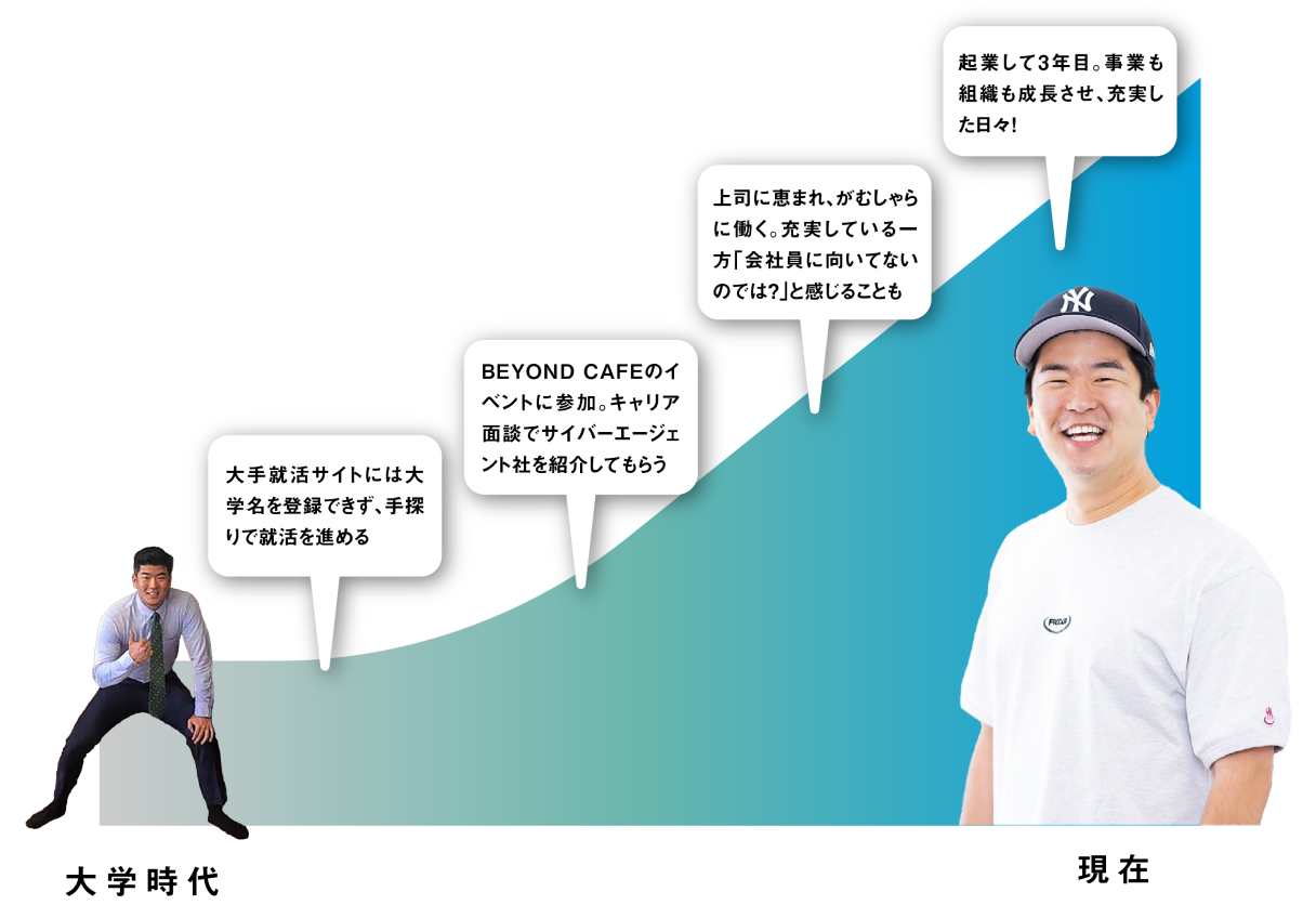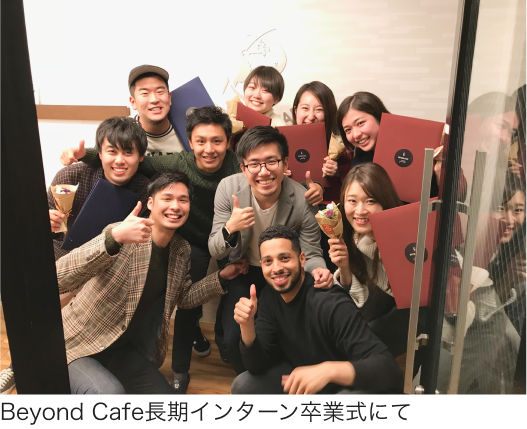 今の僕があるのはBeyond Cafeがあったからだと本気で思っています。 BEYOND CAFEのいちユーザーとしても、長期インターンとしても、何も持っていない僕を受け入れ、成長させてもらいました。僕にとってのファーストステップなんです。 今は起業という挑戦をし、僕自身の可能性が開きつつありますが、今度は僕が同じように次世代に紡いでいこうと思っています。 「優秀だから」という理由ではなく選んだメンバーに信頼と期待を寄せ、事業を拡大していこうとしているのは、Beyond Cafeの思想を受け継いでいるからです。 Beyond Cafeの人たちには本当にたくさんの恩をもらったので、組織の面でも、事業を通して世の中にgoodなことをしていくという面でも、その恩を世の中に返していこうという思いを、ぶらさずに持つことができています。